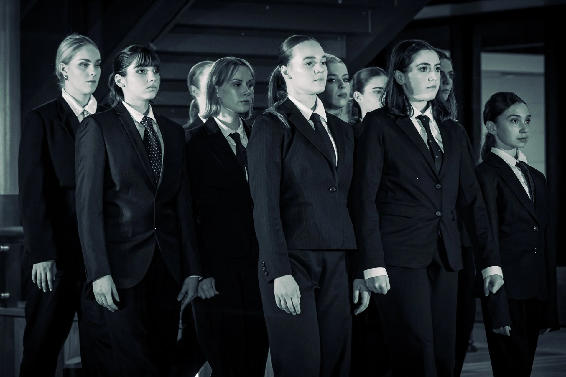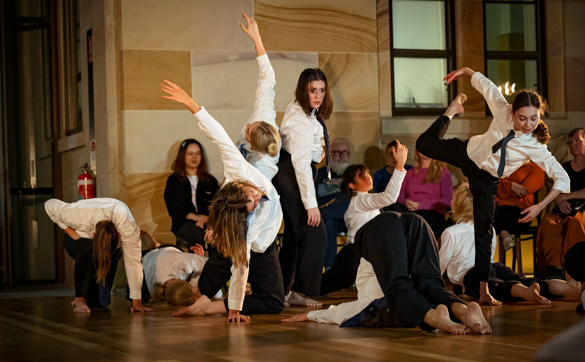 Once the doors were shut, the directorial welcome introduced Wind of Wall Street as an independent dance work developed by recent QUT graduates and students. And then the bell rang, and the Dancers (Maddison Bowyer, Jaide Camlleri, Grace Campbell, Clare Dark, Hannah Groom, Saska Scoon, Floriane Sevault, Mia Sibley, Scotia Taylor, and Anastasia Vogelsang) re-entered the space.