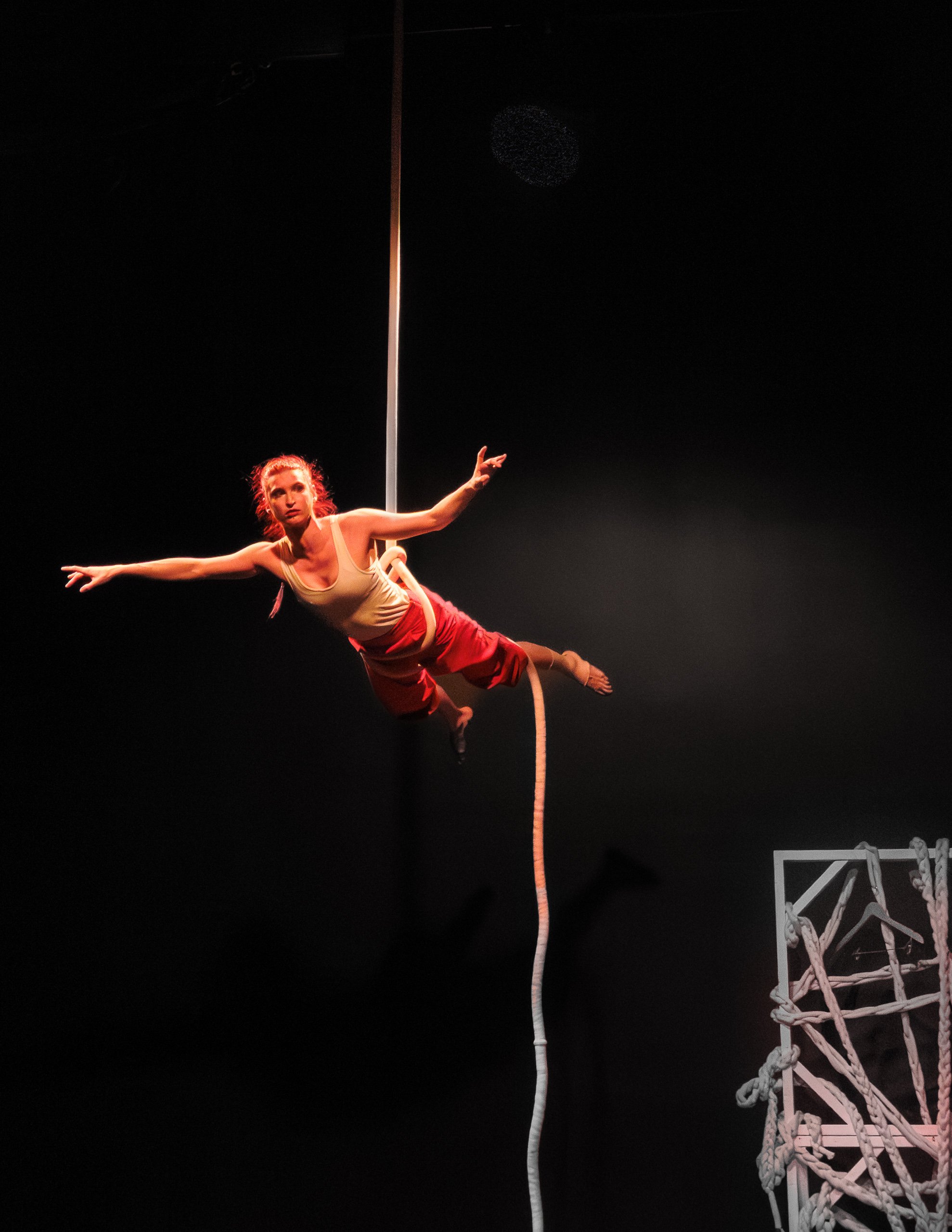 The closing movements of the show were particularly impressive. The fantastic, skillful, red-lit aerial rope solo had everyone holding their breath at the strong climbing, unfurling, and work on the rope—set to one of many excellent musical choices. And the climax of the show, that included the artists working together and climbing upwards to create a memorable final image, set against the aerial rope, was a special way in which to close 6 Degrees.
