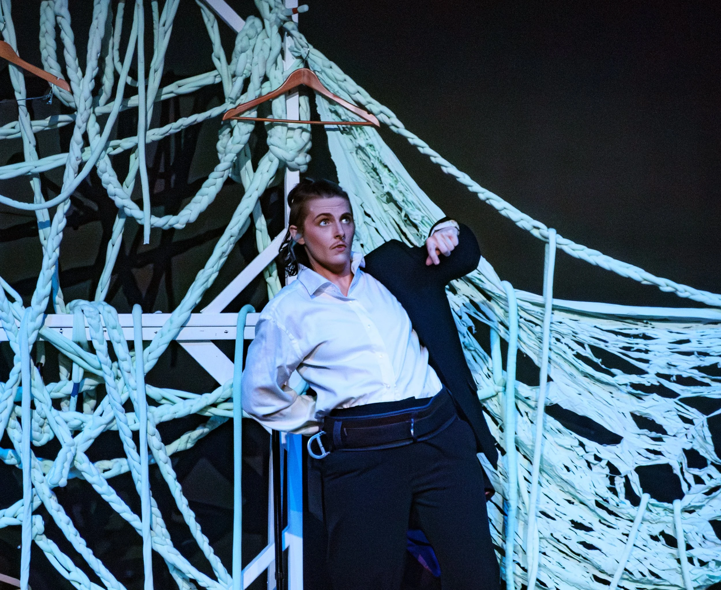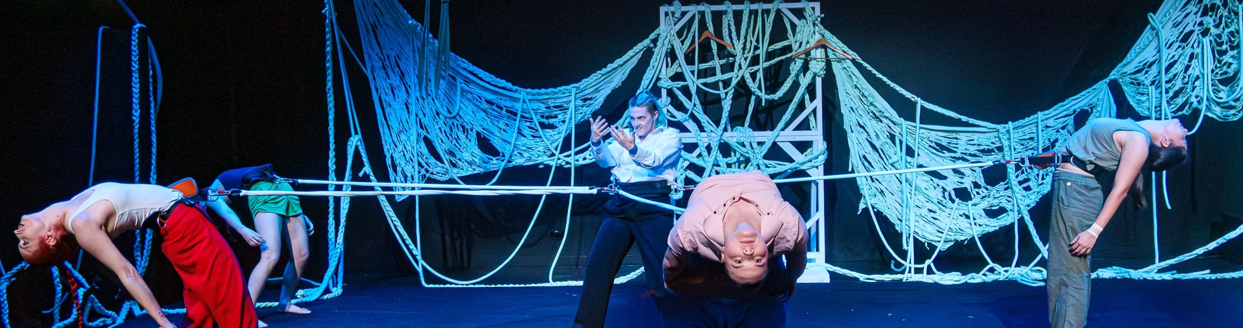 Chimera Arts’ Artistic Director and Choreographer, Lauren Watson—in conjunction with Mia Hughes and Zoe Joiner (Flipside Circus Acrobatic Facilitators and Choreographers)—has created a bold new work that explores the ways in which our lives are often closely inter-connected, and the potential of that social network. The use of ‘100 metres of chunky yarn’ is a clever device to reinforce messages about connection, and about the unravelling of power, represented through the excellent set design, and in the ways in which the artists gradually tear down the barriers and emerge from underneath the pieces.