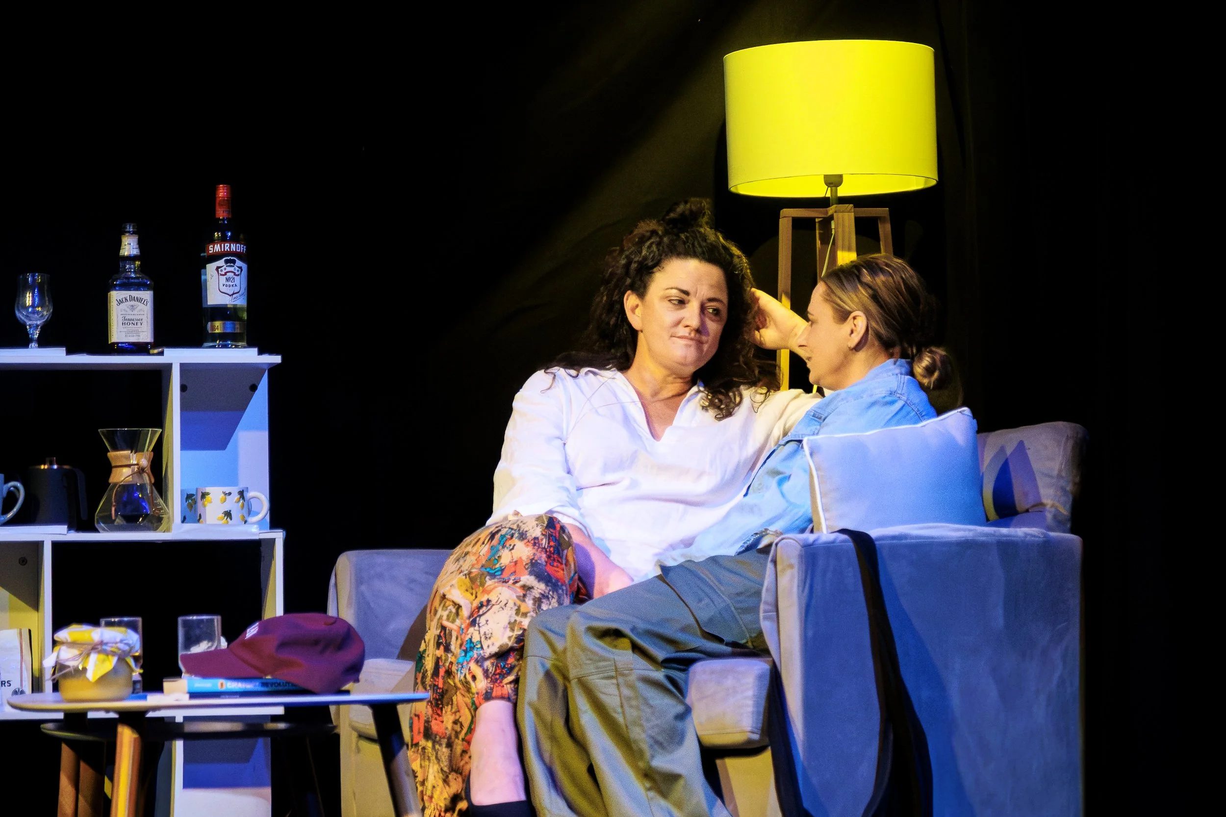 Caroline Sparrow gives a standout performance as Merril. The conversations between Sparrow and Traynor-Boyland‘s digital ‘Angie’ are at times frustrating, poignant and funny—thanks to the excellent work on screen by Traynor-Boyland, and to Sparrow’s on-stage reactions to her A.I. bot. However, when reflecting on the show, I found Sparrow’s scenes with Whittle to be the most memorable. Whittle portrays Raquel as a funny, caring, and strong partner—and as an excellent counterpoint to the grieving and focused Merril. The sofa scene between the lovers is a sensitive and almost joyful moment in the show, which I am sure benefits from the input of both Whichelow and of Heidi Gledhill (Intimacy Director).
