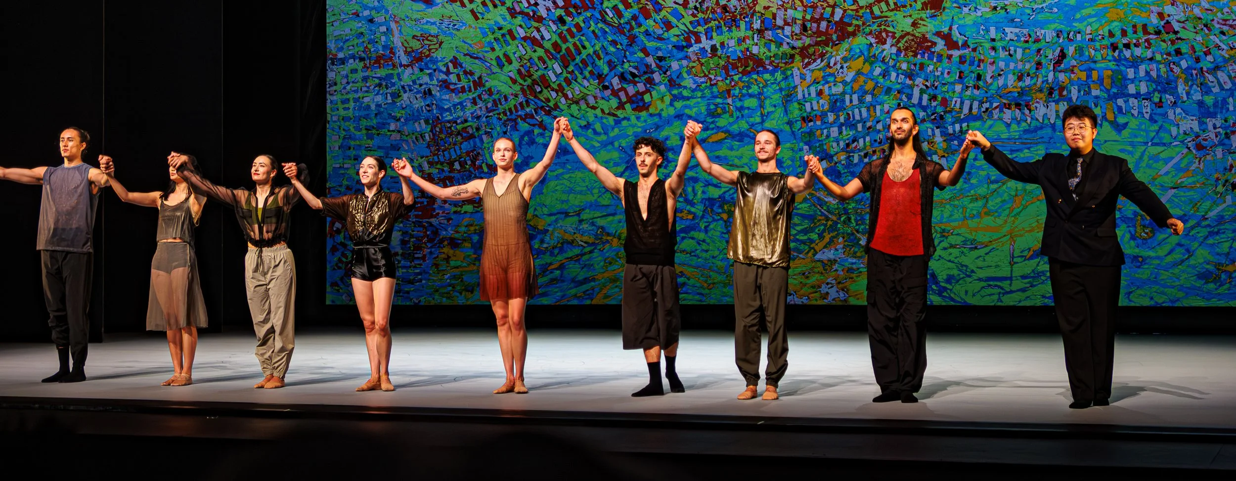 The closing 40-minute On The Other Side was for me the perfect way in which to end the trilogy, set to the very special visual design by Mark Bradford. Bradford’s backdrop appears to change with the lighting and moves of the dancers, for me evoking the colours of the Kimberly Coast. Although trying to resist the temptation to impose a narrative, I read this as a classical portrait of a deathbed scene that inspires moments and memories of the joy and connections of a long life. The dance was intimate, playful, and occasionally breathtaking, with amazing and extended female solos, duets, groups, and ensemble work—evoking a sense of the true joy of living and the intimate tenderness of love. The solos are the highpoint of this piece, where the dance is a perfect ‘duet’ with, and interpretation of, Yanfeng (Tony) Bai’s piano (selected music by Philip Glass and others).