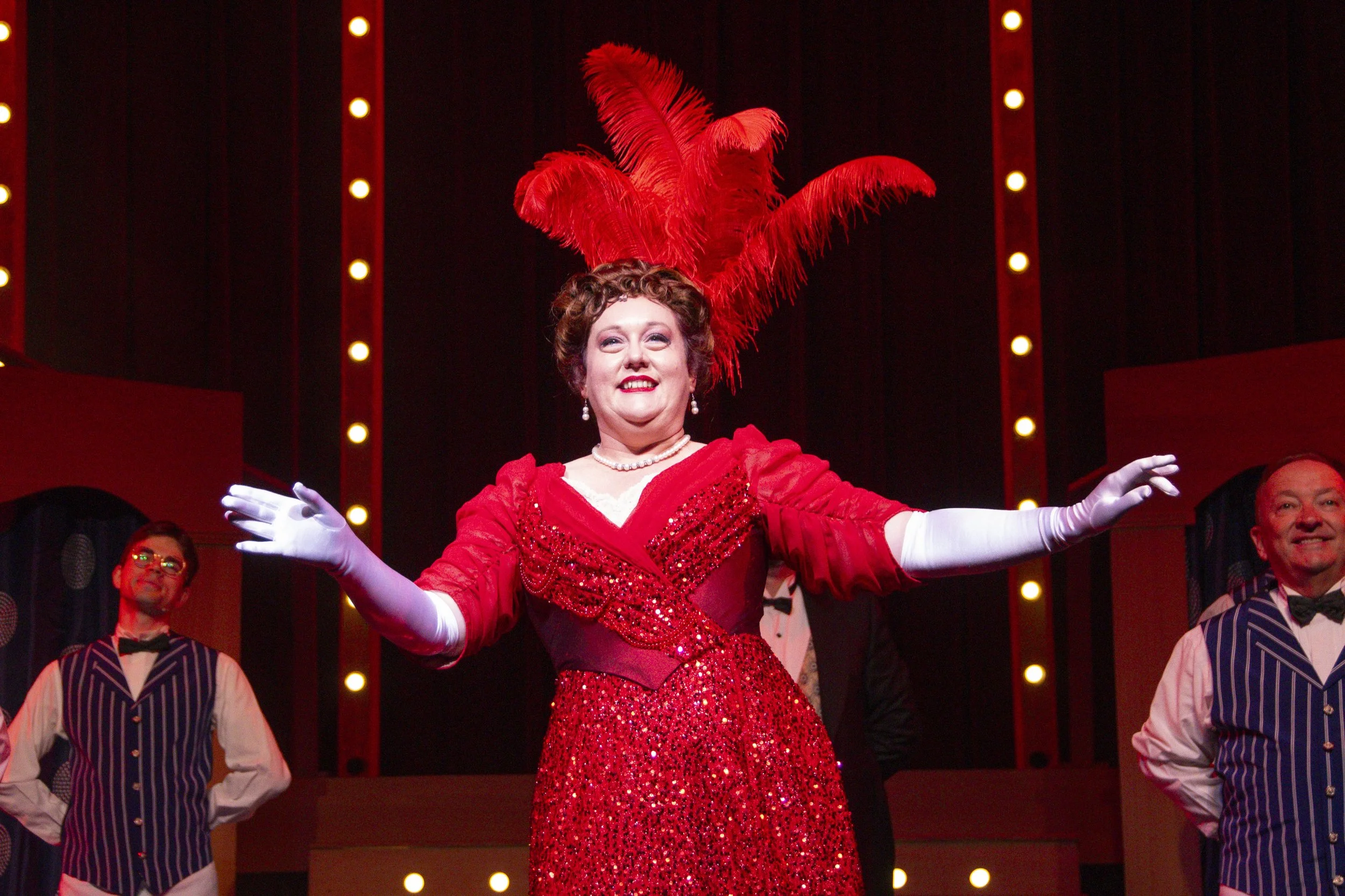 Miranda Selwood is excellent as the gregarious Dolly Gallagher Levi: relishing the comic lines as she pulls out yet another business card that is perfectly suited to the latest opportunity, rocking the red-sequined sparkle as a nightclub chanteuse, and establishing Dolly as a woman not to be meddled with. Selwood can sing, act, and dance, and is so very well-cast as the larger-than-life matchmaker, meddler, opportunist, and life-loving woman. Particularly memorable moments for me included Selwood’s ‘So Long Dearie,’ ‘Before the Parade Passes By,’ and ‘Hello Dolly!’