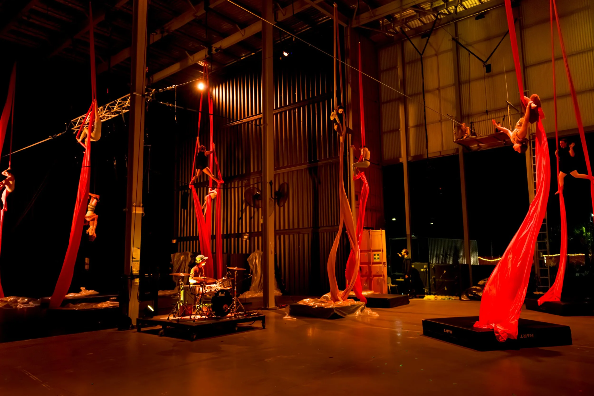 The closing act of the whole show is a visual feast. The high wire ‘fight’ and balancing is incredible. I’m not sure I have ever seen some of the moves that include lying down on the wire, stepping over a fellow performer who is sitting on the wire, and of course the powerful holds dangling from the wire. And, sorry if this is spoiler, but to be in a space where there are performers on each of 8 silks, 2 ropes, and 1 trapeze is breathtaking—where the falling petals are a beautiful way to represent the trickling away of any fear. The final leap and closing crash on the drums are a great way to end this very special celebration of the Brisbane Circus Centre space, of the talents of the Flipside students, of their trainers, and of their fellow (professional) creative collaborators.