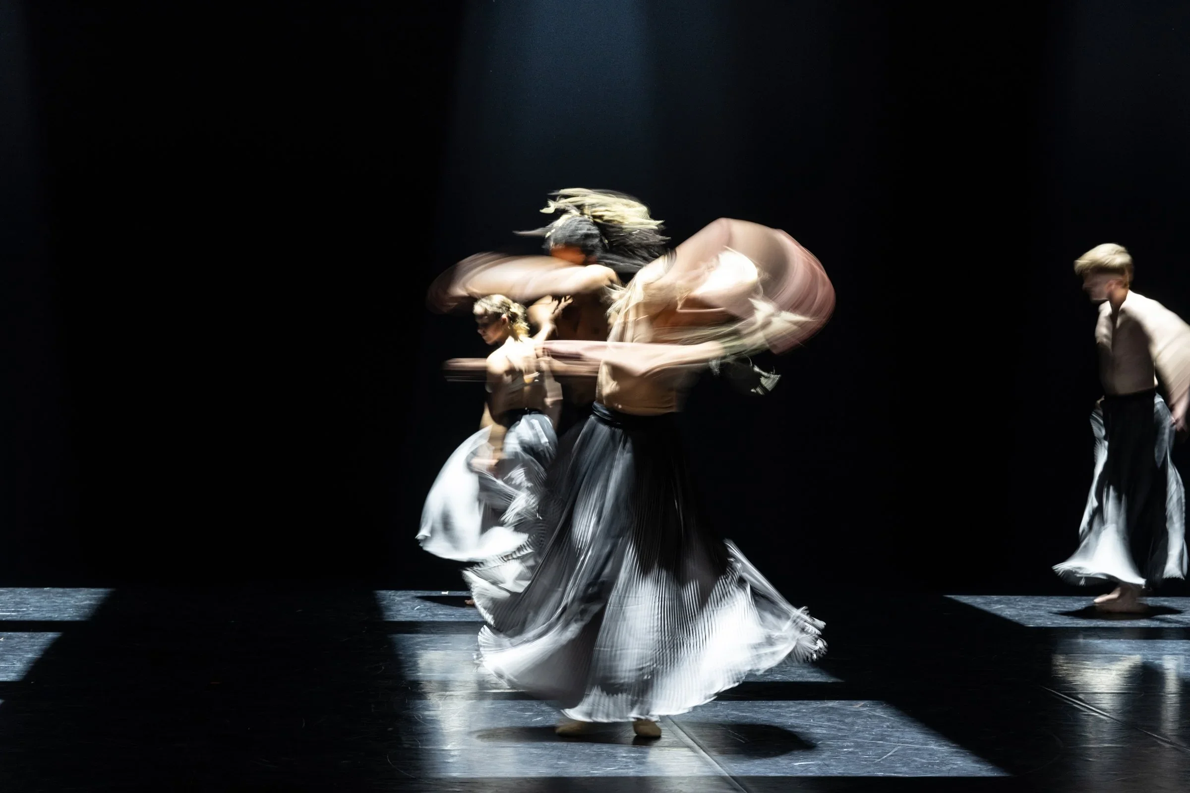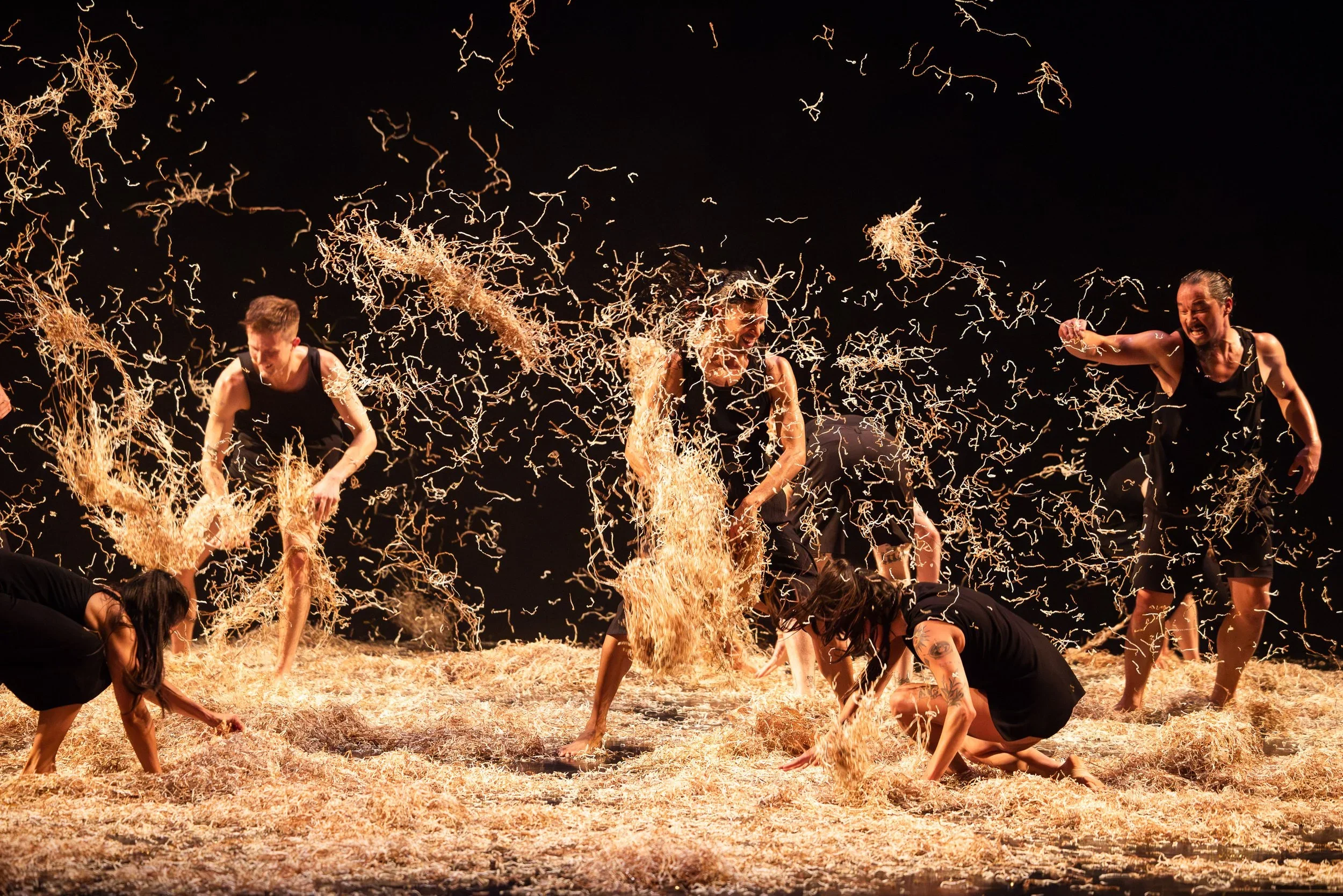As the work moves towards the inevitability of death, the movement that begins with the unravelling of cylindrical hay bales in the autumnal ‘sunshine’—another special element of Bosco Shaw’s lighting design—is one to look forward to. I was engrossed by the dancers’ gleeful separation of the pieces of ‘hay’ as they then threw the material across the stage, playfully using it to suggest the childlike fun that can be found in play and connection. As this movement draws to a close, we sense the winter of life, with the single remaining dancer left gasping for breath under the pile of ‘straw’ and we hear the opening words of the final song.